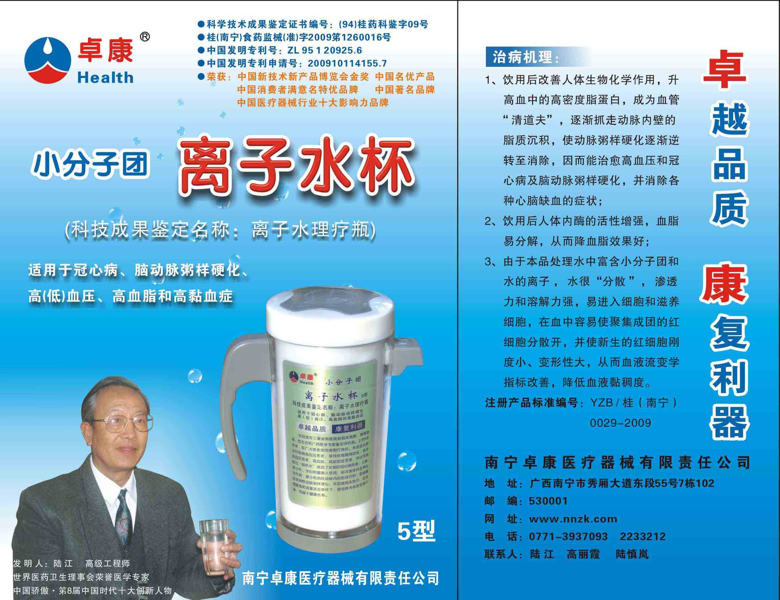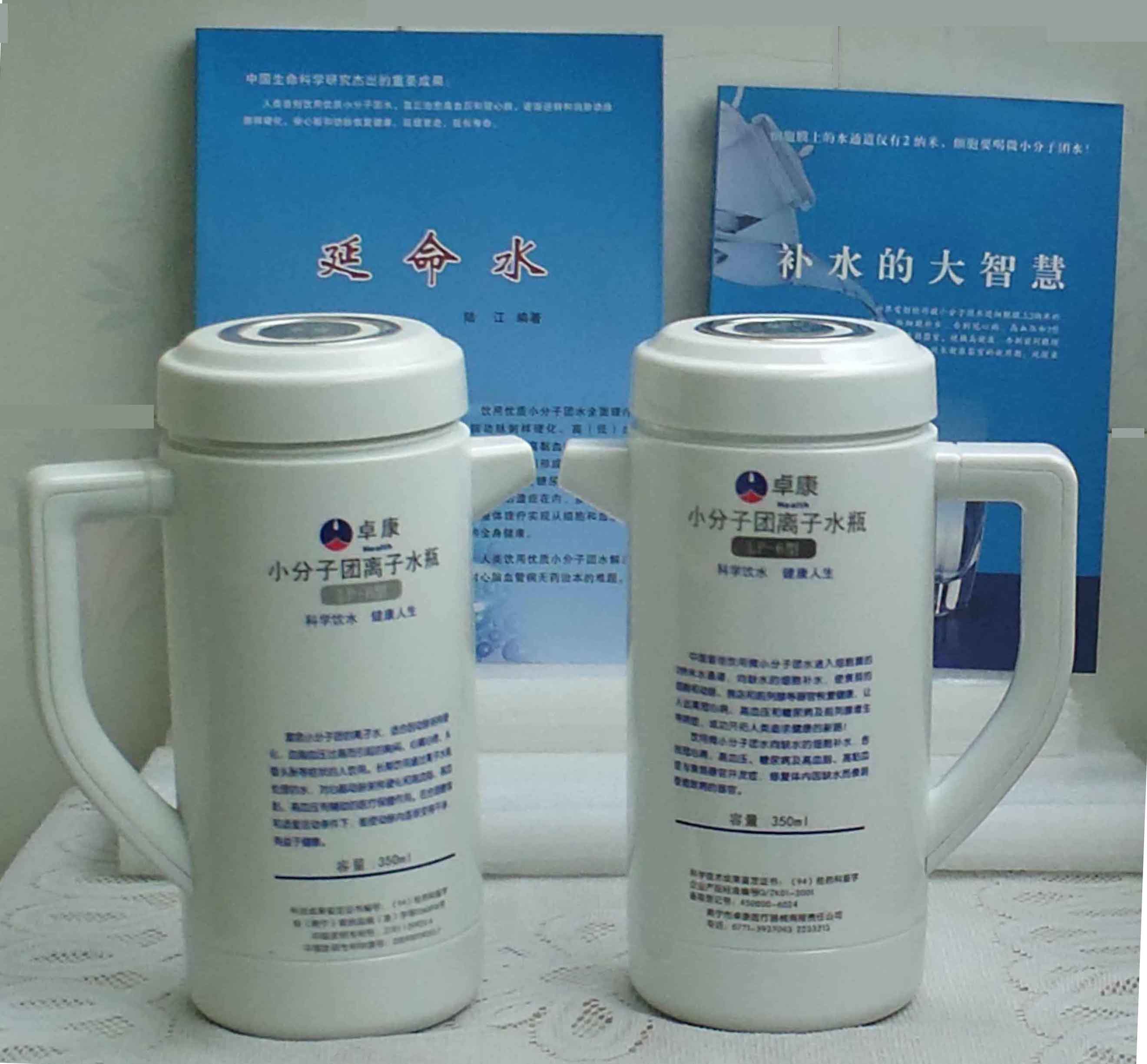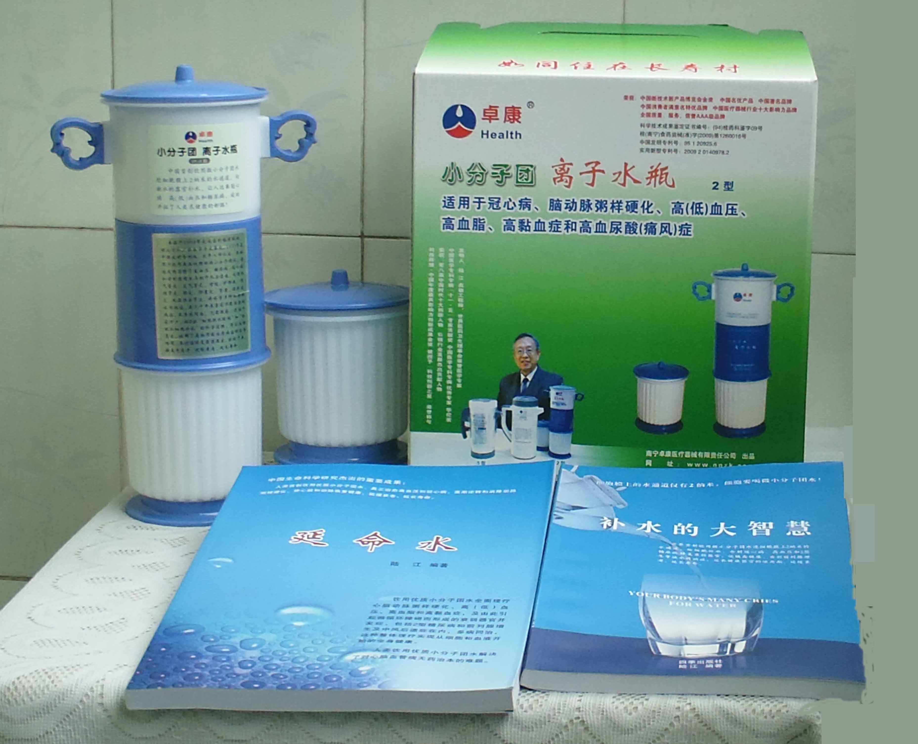 本品大量用戶的使用效果表明,能治愈冠心病、腦動(dòng)脈硬化、原發(fā)性高(低)血壓、高血脂、高粘血癥、高血尿酸癥(痛風(fēng))和2型糖尿病、衰弱器官并發(fā)癥(前列腺增生、腎衰與尿毒癥)及中風(fēng)后遺癥等療效好。產(chǎn)品配信譽(yù)卡。使用壽命30年,不換芯,易清洗。團(tuán)購(gòu)優(yōu)惠。從郵局匯款,匯費(fèi)1%,地址按本頁(yè)下方地址、聯(lián)系人寫(xiě)。從銀行匯款,請(qǐng)點(diǎn)擊[聯(lián)系匯款]欄,從工商銀行匯款,建設(shè)銀行、農(nóng)業(yè)銀行匯款,均免收匯費(fèi),匯款后20--30分鐘內(nèi)發(fā)短信,可用微信轉(zhuǎn)帳,均免匯費(fèi),微信號(hào)即手機(jī)號(hào)13768308380。匯款后,告知你的姓名和地址,我公司聯(lián)系人手機(jī)號(hào)是:13768308380。卓康牌離子水瓶為我公司獨(dú)家生產(chǎn),郵購(gòu)產(chǎn)品配《補(bǔ)水的大智慧》彩印書(shū)一本,另配四季出版社出版的新書(shū)《補(bǔ)水的大智慧》一本,并配光盤(pán)一張(含央視主持人釆訪陸江的對(duì)話視頻)。目前市場(chǎng)和"淘寶網(wǎng)"上有人兜售假冒的偽品,望讀者審察辯別真?zhèn)?,造假者剽竊假冒本公司的各種認(rèn)證、獲獎(jiǎng)獎(jiǎng)項(xiàng)、專利號(hào)和外包裝盒上的中英文字,包括科技成果的鑒定意見(jiàn)等,請(qǐng)讀者注意防偽。如何識(shí)別假貨?已經(jīng)買(mǎi)了假貨怎么辦?(請(qǐng)點(diǎn)擊[打假掠影][打假掠影])。