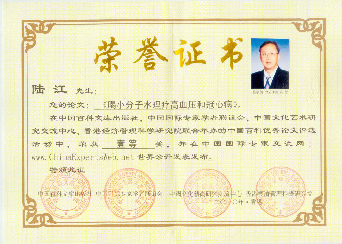-----我是從事建筑的高工,本來(lái)沒(méi)有資格去攻克醫(yī)學(xué)難題,卻為了自身健康才扣響醫(yī)學(xué)的大門(mén)。由于我1990年患高血壓,因怕中風(fēng)才研究發(fā)明了離子水瓶,我把水處理成微小分子團(tuán)水,飲用后治愈了高血壓。便于1993年底送到三家省級(jí)醫(yī)院做臨床試用4個(gè)月。經(jīng)北京和廣西醫(yī)學(xué)專家鑒定:"降脂降壓效果好"," 能擴(kuò)大心腦動(dòng)脈流量,改善心腦電圖以及微循環(huán)","對(duì)治療心腦動(dòng)脈粥樣硬化、高血壓、高血脂有良好的醫(yī)療保健作用。""產(chǎn)品的技術(shù)性能和療效達(dá)到了同類產(chǎn)品的國(guó)內(nèi)領(lǐng)先水平,經(jīng)廣西醫(yī)學(xué)科學(xué)情報(bào)研究所檢索,未見(jiàn)國(guó)外有類似報(bào)道。"中國(guó)醫(yī)學(xué)科學(xué)院張正國(guó)教授從美國(guó)國(guó)立醫(yī)學(xué)圖書(shū)館數(shù)據(jù)庫(kù)存Medline檢索英俄文資料,均未見(jiàn)類似報(bào)告。2000年上市后,我為了對(duì)消費(fèi)者負(fù)責(zé)而繼續(xù)觀察研究,一直通過(guò)《信譽(yù)卡》和《質(zhì)量跟蹤調(diào)查書(shū)》向患者承諾療效,請(qǐng)用戶使用6個(gè)月后反饋效果。和脂壓患者飲用2至5個(gè)月內(nèi),消除癥狀,停服藥物,血壓正常;冠心病患者飲用3~5個(gè)月逐漸減輕至消除心絞痛、房顫等癥狀,不再服藥,飲用1年左右心電圖正常,經(jīng)冠脈造影掃描無(wú)明顯狹窄,表明冠心病痊愈。大量患者還反映許多衰弱器官被修復(fù),讓前列腺增生、慢性咽喉炎、慢性氣管炎、支氣管炎、慢性胃炎、腸炎和膽囊炎等不藥而愈;2型糖尿病患者是因?yàn)橐葝u衰弱致病,飲用該水半年至一年,逐漸減藥至停藥,血糖尿糖正常,真正治愈2型糖尿病。中風(fēng)后遺癥患者飲用六七個(gè)月,可逐漸減輕至消除肢體和語(yǔ)言障礙,表明飲用該水能讓壽命很長(zhǎng)的神經(jīng)元細(xì)胞逐漸修復(fù),奇跡般地恢復(fù)肢體和語(yǔ)言功能。飲用后還使胸腺和脾臟兩個(gè)重要的免疫器官被修復(fù)和增強(qiáng),產(chǎn)生免疫細(xì)胞多,提高了免疫力,使人不生病或少生病。自此, 飲用微小分子團(tuán)水創(chuàng)造了攻克冠心病、高(低)血壓和糖尿病三大醫(yī)學(xué)難題的奇跡。人們對(duì)此感到不可思議,但實(shí)踐是檢驗(yàn)真理的唯一標(biāo)準(zhǔn)。