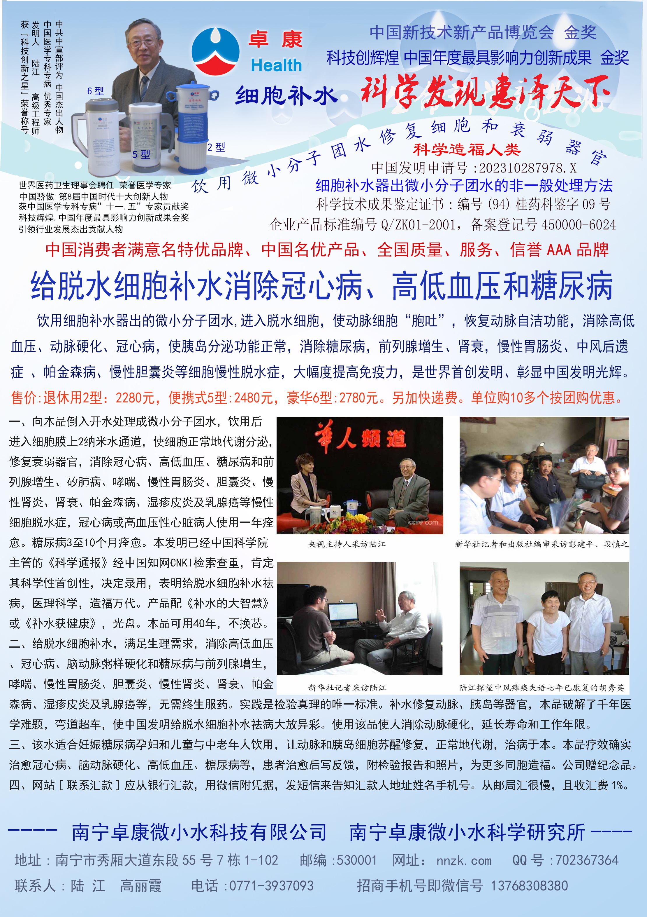 人類幾千年來(lái)患以上病癥需終生服藥,幾十年也不能治愈。可是我國(guó)南寧的高級(jí)工程師陸 江,于1990年想根治高血壓,研究發(fā)明了離子水瓶,處理出微小分子團(tuán)水供飲用,經(jīng)過(guò)醫(yī)院臨床試用和專家鑒定,1999年獲中國(guó)發(fā)明專利權(quán),產(chǎn)品于2000年投放市場(chǎng)后一直跟蹤調(diào)查,據(jù)全國(guó)各地用戶反饋:祛除了高低血壓、糖尿病和冠心病,并使前列腺增生、咽喉炎、鼻竇炎、慢性氣管炎、支氣管炎、矽肺病、哮喘、慢性胃炎、腸炎、慢性膽囊炎、慢性腎炎、腎衰、膀胱炎、便秘、痔瘡、風(fēng)濕性關(guān)節(jié)炎和濕疹皮炎及中風(fēng)后遺癥等病癥不藥而愈。為什么喝微小水能治20多種?。筷?nbsp;江從1991年德國(guó)科學(xué)家發(fā)現(xiàn)細(xì)胞膜水通道僅為2納米獲得啟發(fā),認(rèn)為多種器官患病是因細(xì)胞脫水,不能正常代謝和分裂增殖,才使器官細(xì)胞減少致衰弱萎縮而形成細(xì)胞缺水性病癥。22年來(lái)的實(shí)踐有力地支持了“細(xì)胞脫水致病”這一重要論點(diǎn),表明喝微小水可滿足細(xì)胞的生理需求,補(bǔ)水就能祛病,是生命科學(xué)新亮點(diǎn)。