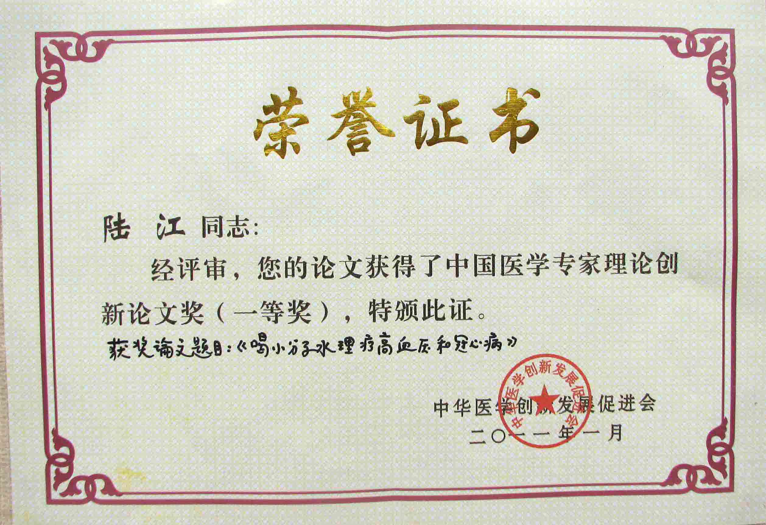 新疆63歲的賀兆生飲用一年,冠心病未愈,他用電話介紹是食堂管理員,問(wèn)他食量多少?說(shuō)吃七八分飽,睡前還吃兩袋牛奶,陸 江說(shuō)我在論文和書(shū)中多次批判“吃七八分飽”,關(guān)照患者務(wù)必用“己饑方食”控制主食肉食量,要他把牛奶改在早中餐吃,減少主食肉食量,建議不吃晩餐,晚上只吃一個(gè)蘋(píng)果,再經(jīng)幾個(gè)月補(bǔ)水節(jié)食,治愈了21年的冠心病和肥胖、失眠等病,信中由衷地感激陸 江為再生父母。[13]因?yàn)獒t(yī)生從未過(guò)問(wèn)他的膳食習(xí)慣,只管開(kāi)處方藥或手術(shù),父母也不會(huì)叫他不吃晩飯。